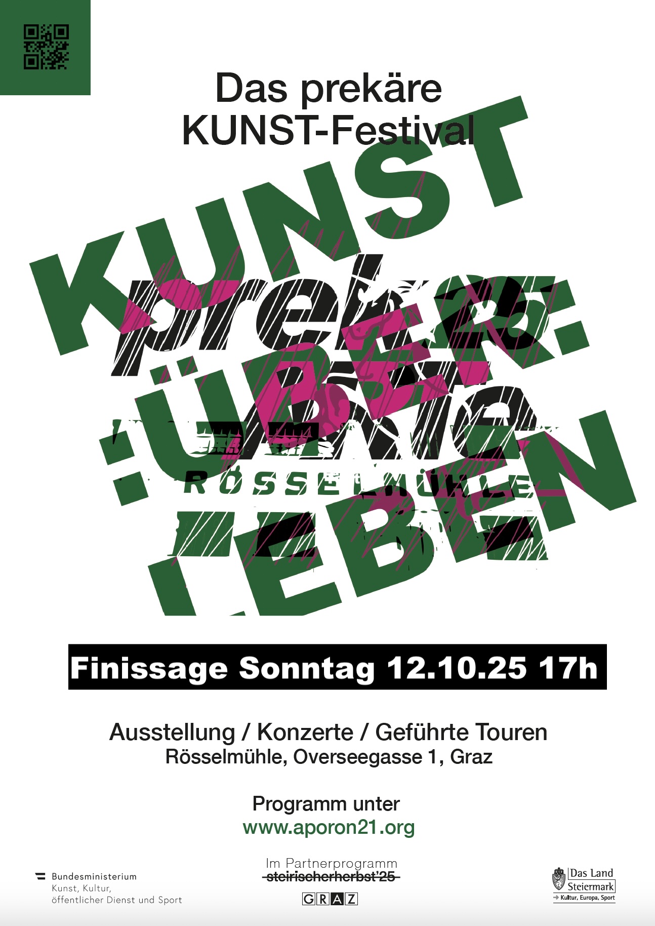 APORON 21 die prekARTe ’25 KUNST:ÜBER:LEBEN Festival   15.9.–18.10. Kunst Klub Kräftner Reitschulgasse 13 8010 Graz Mi–Sa 19:00–22:00 und zu den Veranstaltungen 20.9.–12.10. Rösselmühle Oeverseegasse 1 8020 Graz Öffnungszeiten nach Vereinbarung Eintritt: Wertschätzungsbeitrag 20.9., 16:00 Eröffnung in der Rösselmühle 3.10., 19:00 Eröffnung im Kunst Klub Kräftner Führungen für Kleingruppen buchbar unter anmeldung aporon21.org Das vollständige