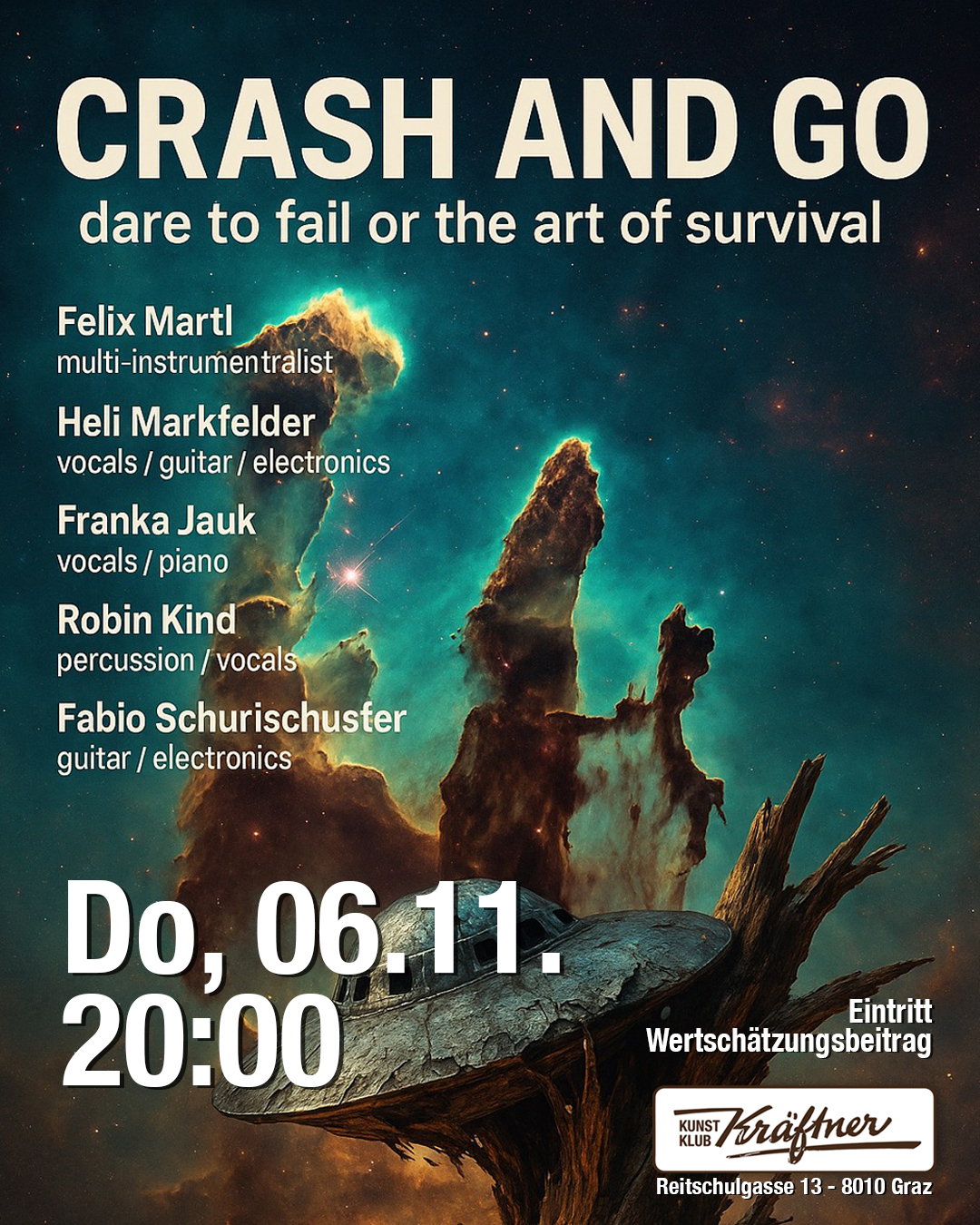 CRASH AND GO Dare to fail or the art of survival November 6, 2025 · 8:00 PM Kunst Klub Kräftner · Graz A sound. A fall. A new beginning. Four artists turn failure into music — raw, fragile, true. Between silence and renewal unfolds the art of survival. Felix Martl – multi-instrumentalist @feiiixmusic Heli Markfelder – vocals …